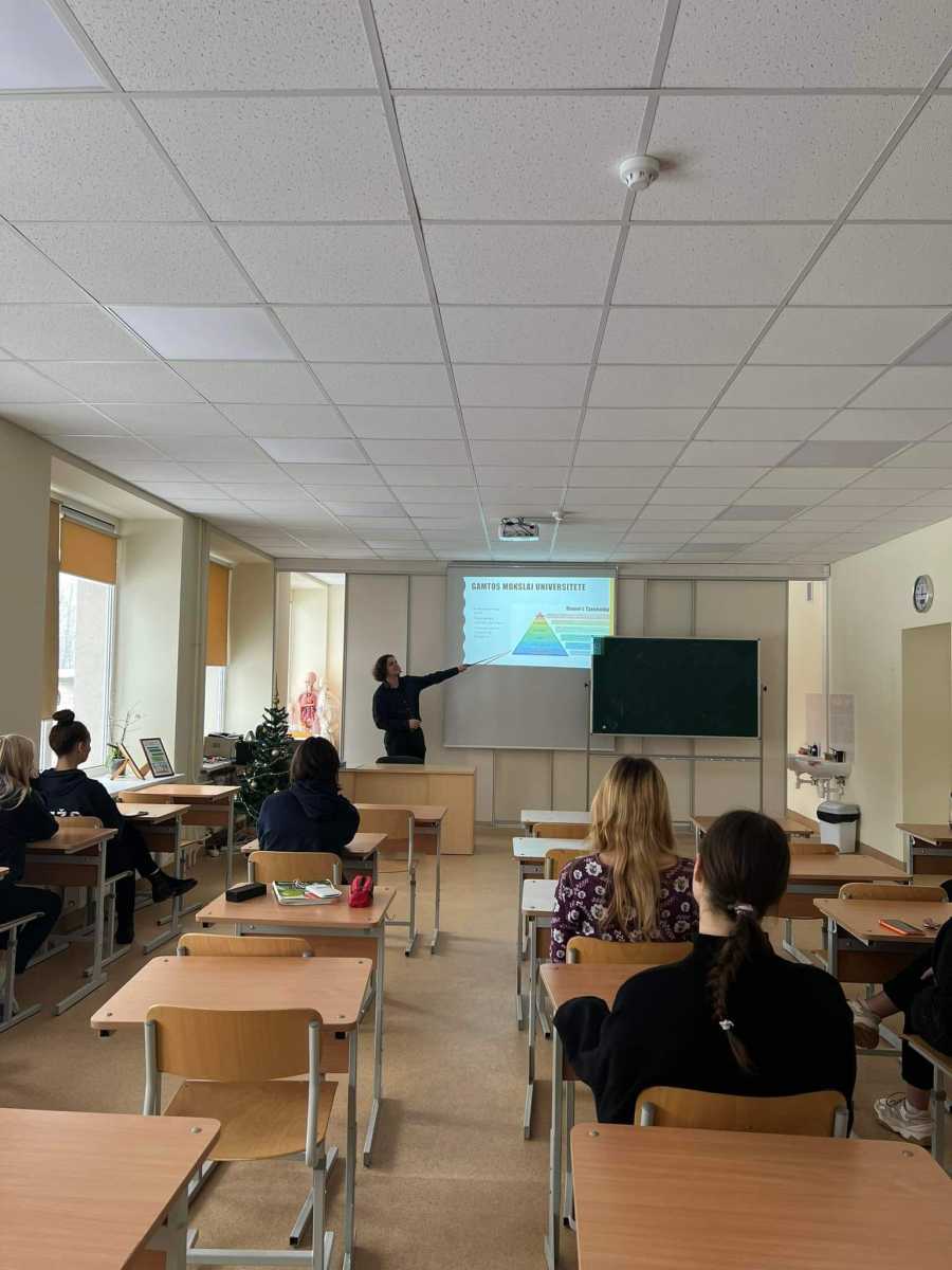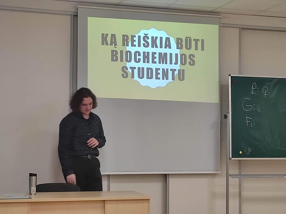 Kalėdiniu laikotarpiu III–IVg klasės mokiniai bendravo su biochemijos studentu Kristijonu Raibužiu, kuris mokosi University of Worcester.IVg klasės mokiniams priminė genetikos pagrindus, supažindino su jos galimybėmis. Mokiniai sužinojo, kad tai ne tik ligų diagnozavimas ir gydymas, bet ir rūšių įvairovės užtikrinimas, evoliucijos raidos analizavimas bei vaistų kūrimas. Malonaus bendravimo metu gimnazistai diskutavo apie biologijos mokslo naujoves, teikiamas galimybes. Kristijonas pristatė savo studijas ir pateikė patarimus, kaip reikia rinktis specialybę, kokių pastangų bei pasitikėjimo savo jėgomis turi turėti kiekvienas jaunuolis. Taip pat akcentavo kiekvieno žmogaus atvirumą naujovėms ir žingeidumą tyrinėti, kurti bei atrasti savo sritis.Dėkojame už netradicinę pamoką ir linkime tolimesnės sėkmės.