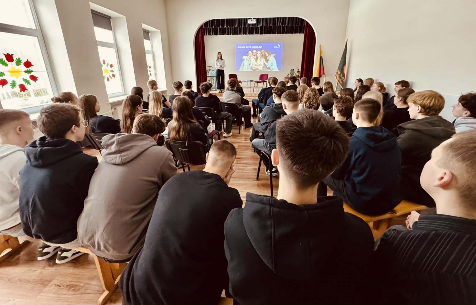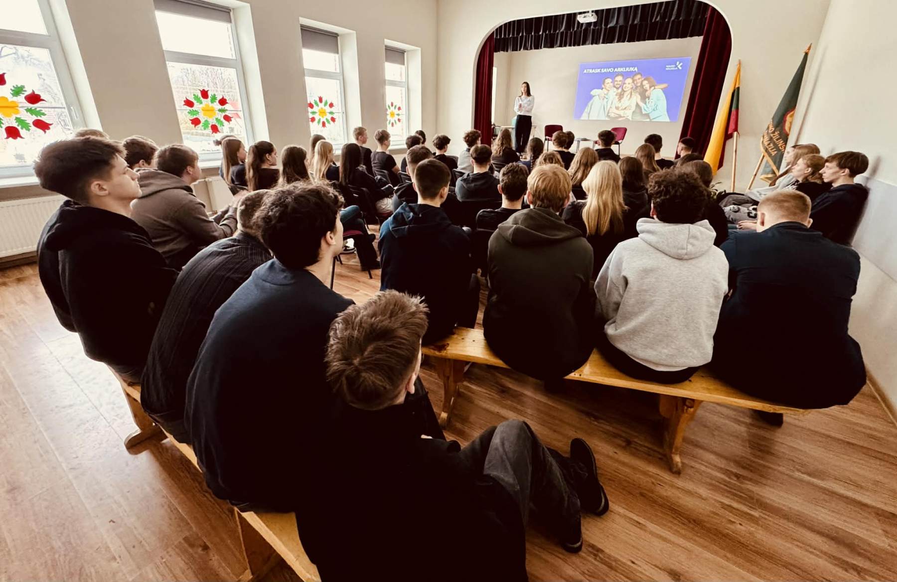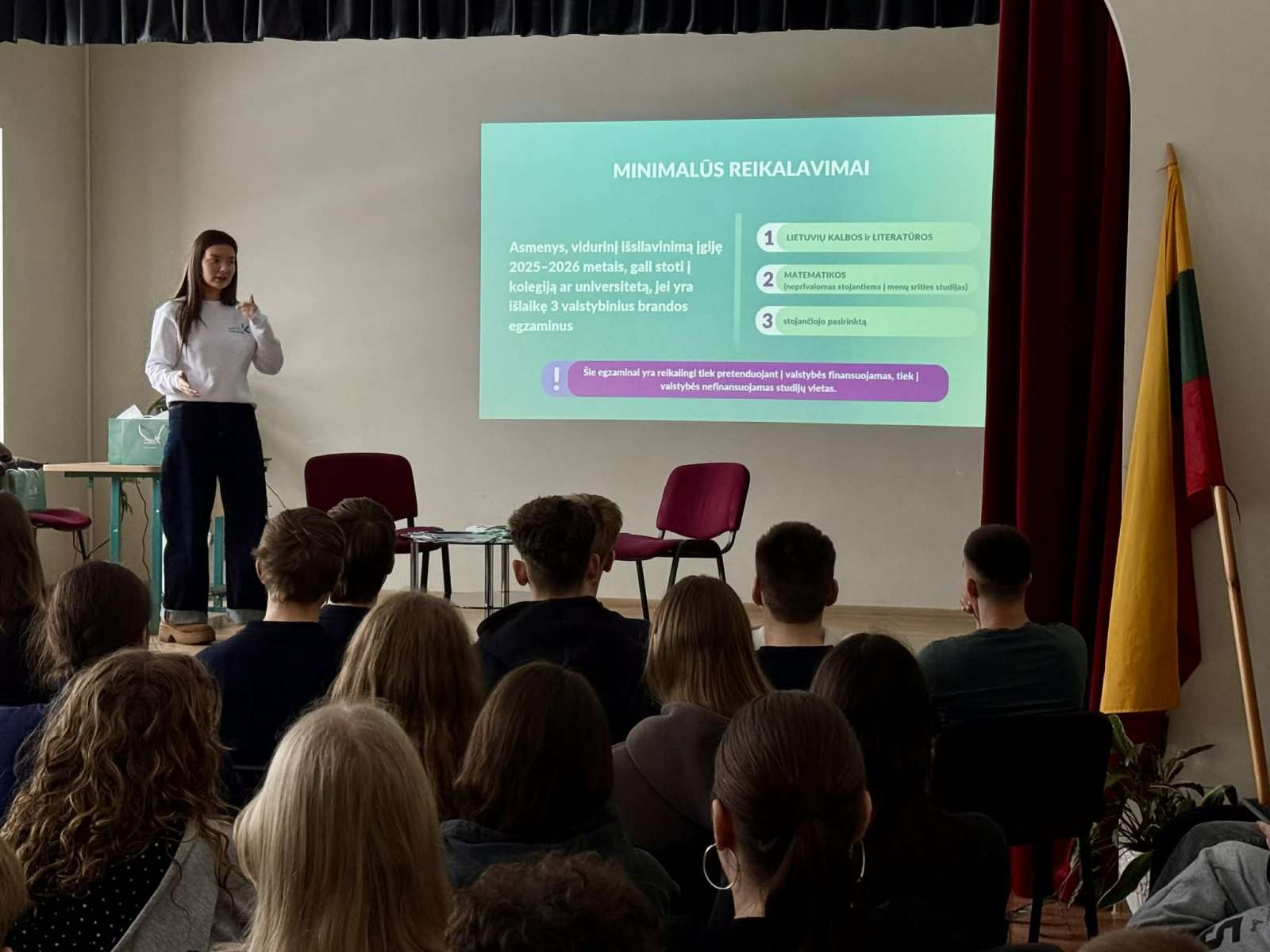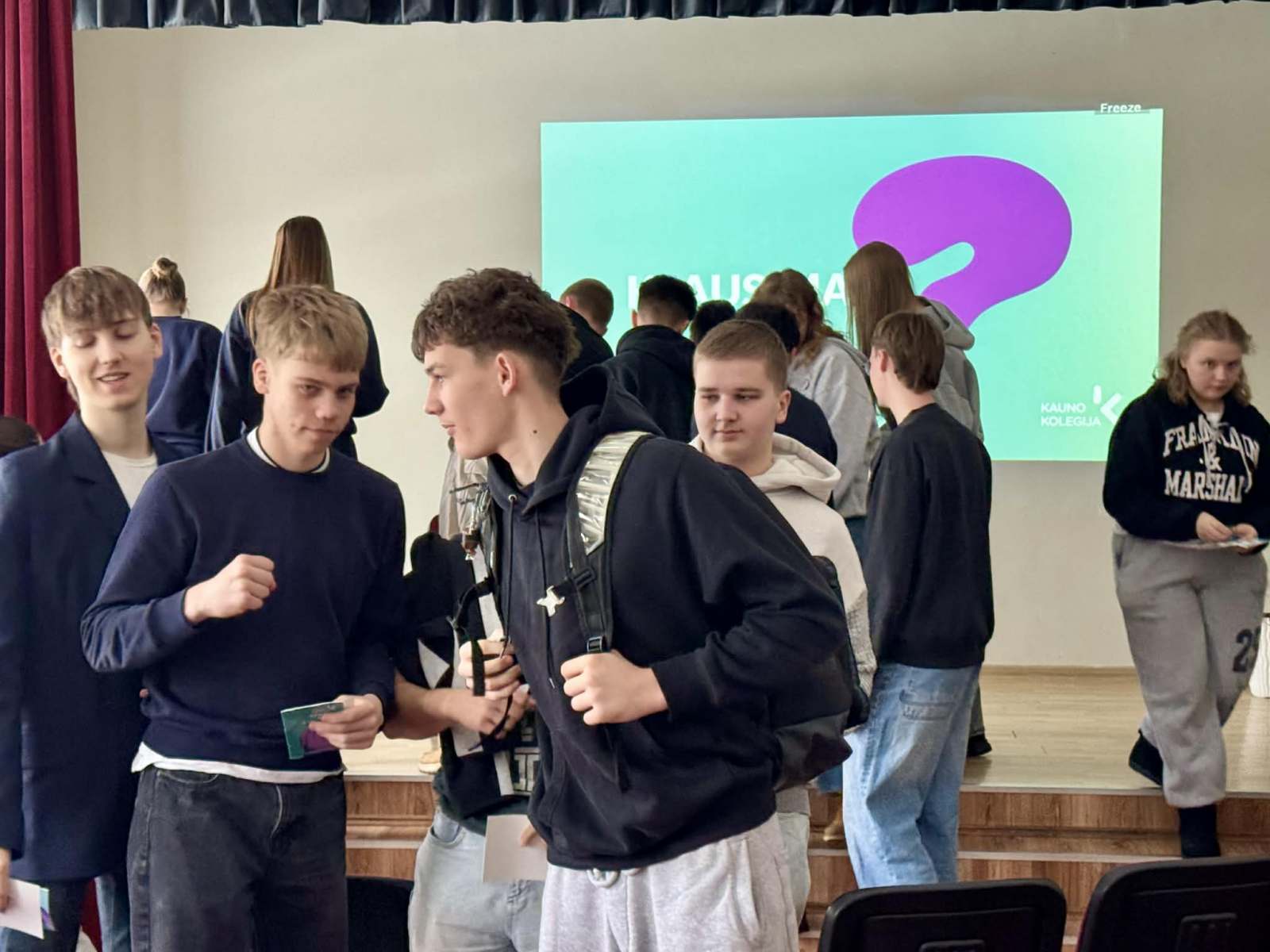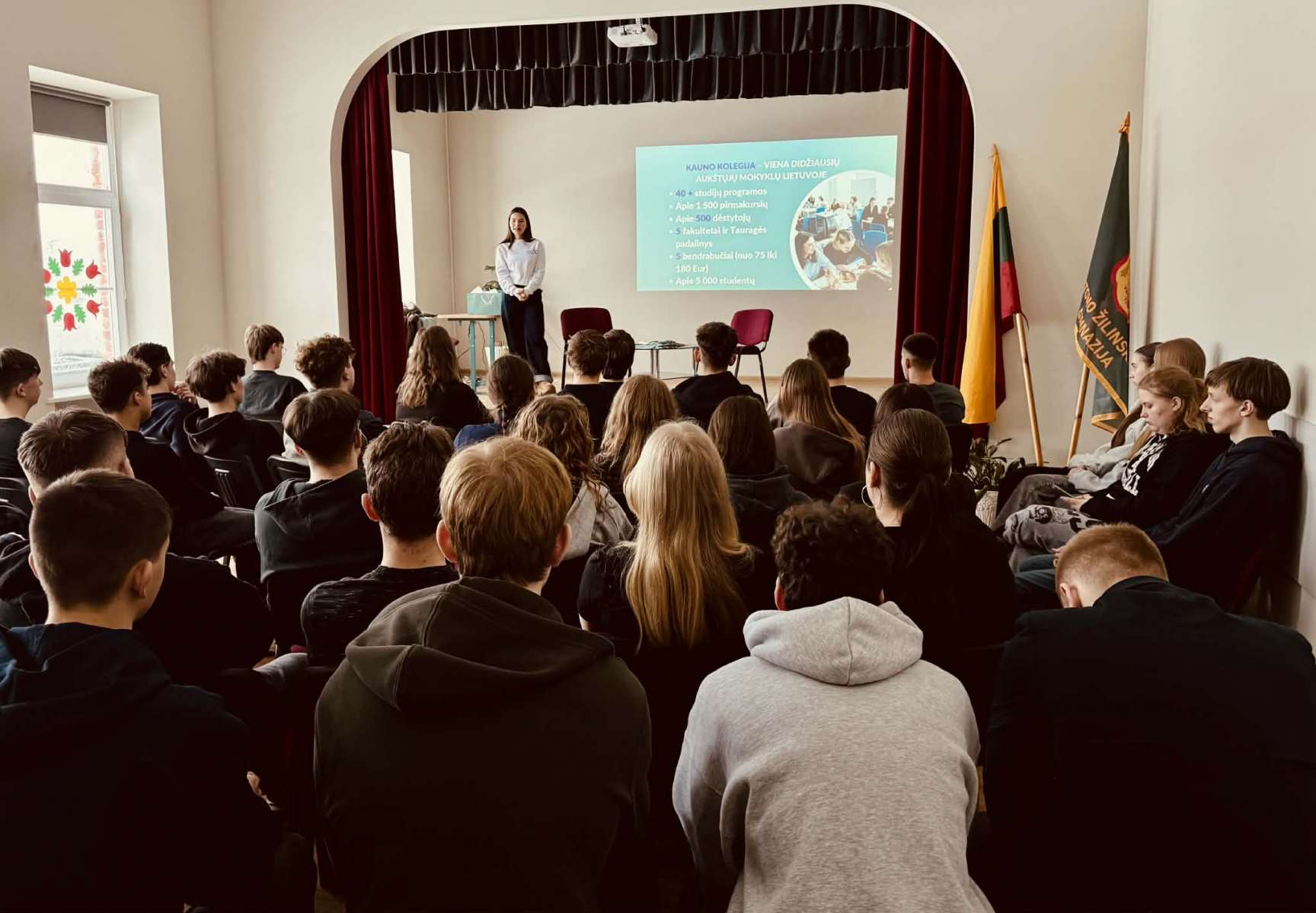 Vasario 25d. Prienų r. Suvalkijos gimnazijos Veiverių T.Žilinsko skyriaus mokyklos salėje tvyrojo ne įprasta pamokos nuotaika, o susitelkimas, kai kiekvienas klausimas – apie rytojų. Čia vyko karjeros ugdymo susitikimas su Kauno kolegijos atstove – renginys, kuris daugeliui mokinių tapo ne tik informaciniu, bet ir įkvepiančiu postūmiu rimčiau pagalvoti apie savo ateities kelią.