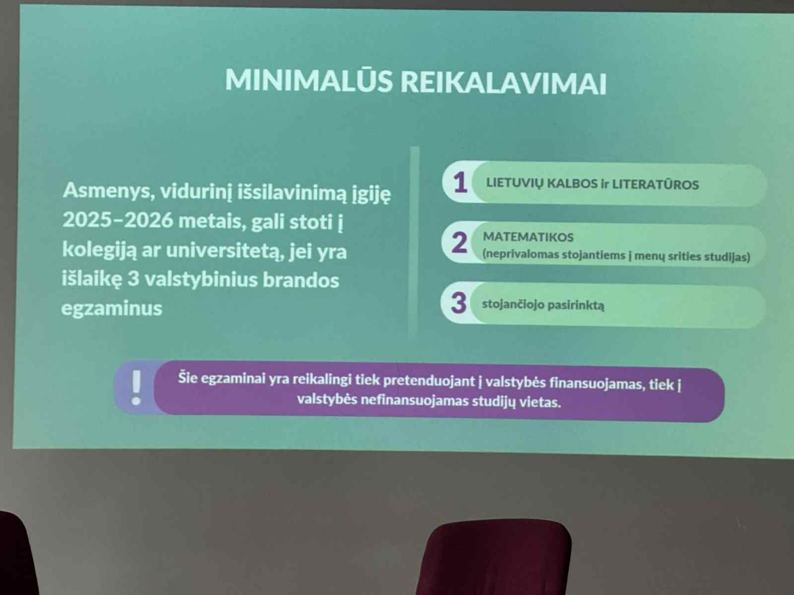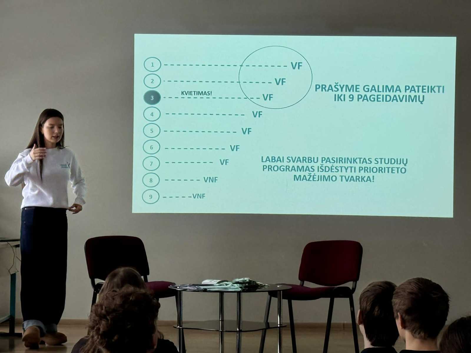 Pristatymo metu aiškiai ir struktūruotai buvo atskleistas aukštojo mokslo pasaulis: nuo studijų programų įvairovės iki stojimo subtilybių, nuo konkursinio balo skaičiavimo iki papildomų galimybių, kurios dažnai lieka nepastebėtos. Sudėtingi procesai buvo pateikti suprantamai, be perteklinės biurokratijos, bet su aiškiu akcentu – sprendimai šiandien tiesiogiai kuria rytojų.