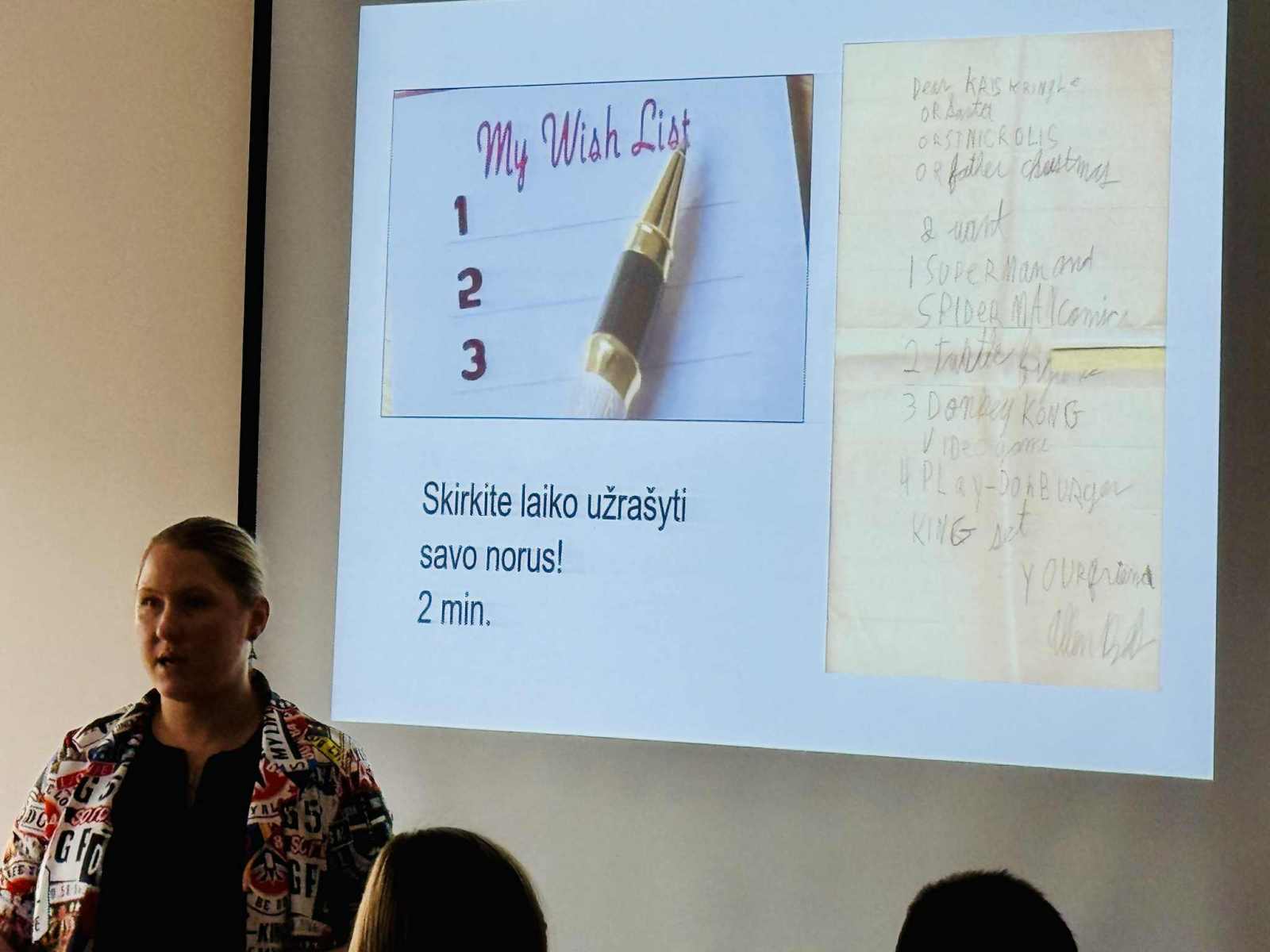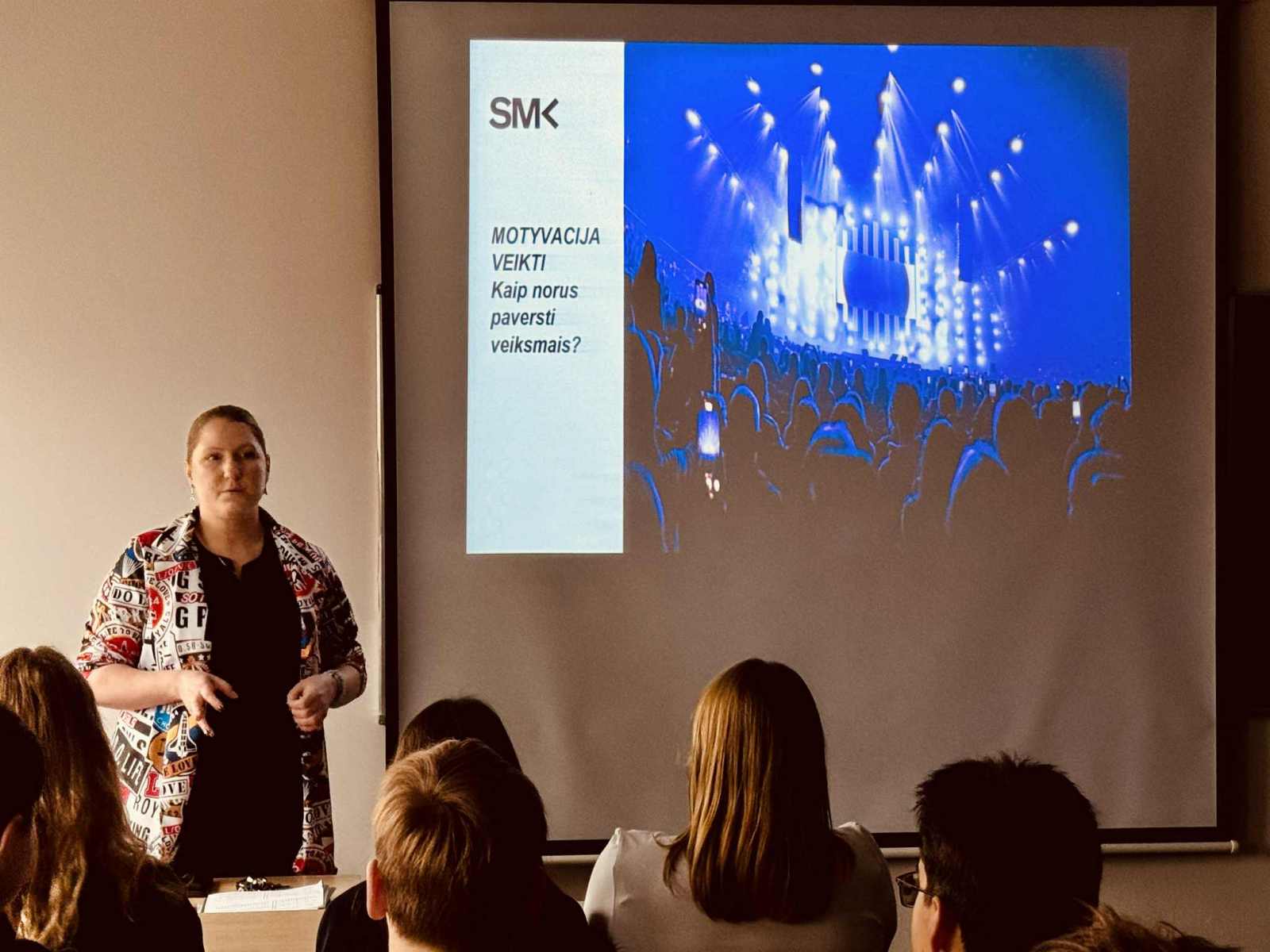 2025 m. lapkričio 18 d. Suvalkijos gimnazijos Veiverių skyriuje lankėsi SMK aukštosios mokyklos dėstytoja ir projektų vadovė Ona Peičiūtė. Susitikimas 7-10 klasių mokiniams tapo prasminga proga jaunimui apmąstyti savo tikslus, svajones ir tai, ką iš tiesų reiškia žengti pirmuosius sąmoningus žingsnius į savo ateitį. Dėstytoja kalbėjo apie motyvaciją ir vidinius resursus, kurie padeda žmogui augti. Ji akcentavo, kad daugelis norų lieka neįgyvendinti ne todėl, kad jie būtų nepasiekiami, o todėl, kad pritrūksta aiškaus plano, pasitikėjimo savimi ir drąsos pradėti. Mokiniai buvo pakviesti įsivertinti savo svajones, mintyse patikrinti, kas juos labiausiai įkvepia, o kas – stabdo. Diskusijos vyko atvirai, jaunuoliai noriai įsitraukė, dalijosi savo mintimis ir klausimais. Aktyviausieji buvo paskatinami įvairiomis dovanėlėmis. Viena iš užduočių, kuri sulaukė daugiausia susidomėjimo, buvo norų vizualizavimas ir jų suskirstymas pagal laikotarpius: nuo dešimties metų perspektyvos iki veiksmų, kuriuos galima atlikti jau šiandien. Tai padėjo mokiniams suprasti, kaip svarbu tikslus „suskaidyti“ į mažus, realiai įgyvendinamus žingsnius. Dėstytoja pabrėžė – planuoti verta tik tai, kas priklauso nuo paties žmogaus, nes sėkmės pagrindas prasideda būtent nuo asmeninės atsakomybės.