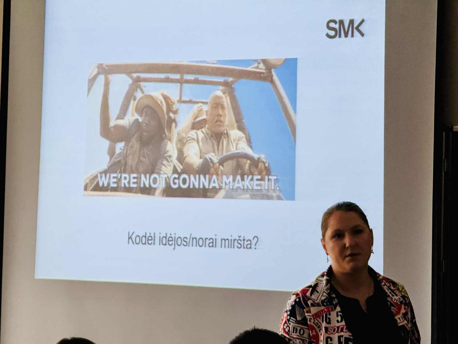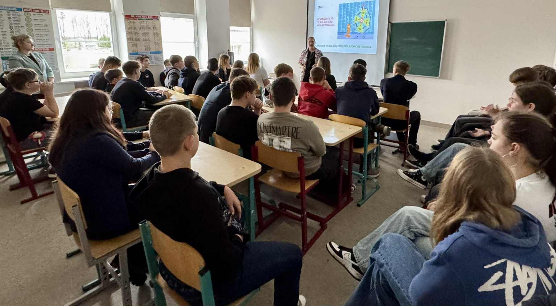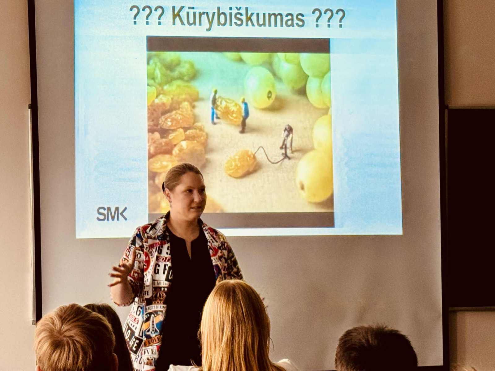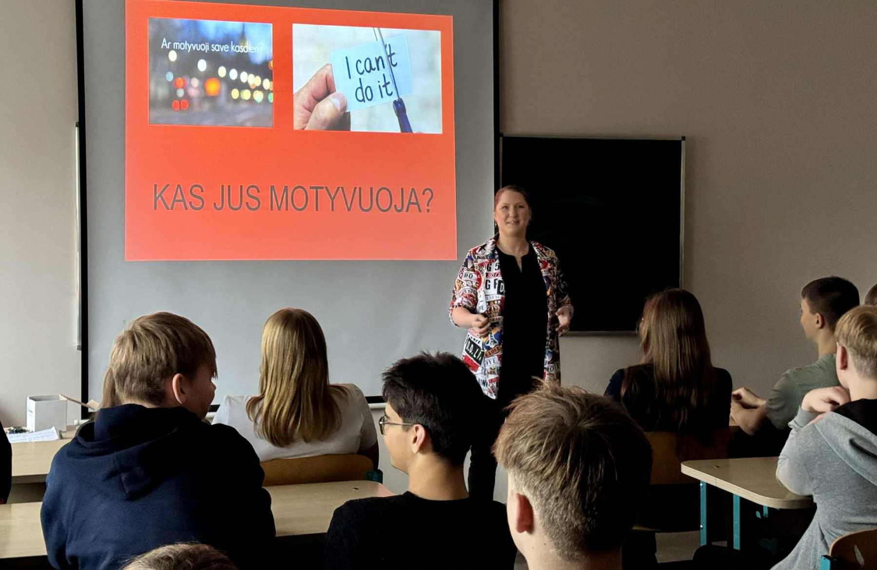 Vizito metu mokiniai taip pat analizavo, dėl kokių priežasčių idėjos dažnai „užstringa“ ir neperauga į realų veiksmą. Kalbėta apie baimę suklysti, aplinkinių nuomonės įtaką, per didelius lūkesčius sau ir nuolatinį atidėliojimą. Diskusijos metu buvo akcentuota, kad svarbiausia – nebijoti pradėti, o klaidos yra natūrali mokymosi proceso dalis. Susitikimas nepraėjo be praktinių pavyzdžių ir įkvėpimo iš realaus gyvenimo. Dėstytoja dalijosi istorijomis apie jaunus žmones, kurie išdrįso kurti, bandyti ir nepasiduoti – ir šiandien yra savo sričių profesionalai. Tokie pasakojimai įrodė mokiniams, kad amžius tikrai nėra kliūtis pradėti kurti savo ateitį. Vizitas baigėsi mokinių mini apklausa, aktyviausiųjų paskatinimu ir kvietimu toliau domėtis galimybėmis, kurias suteikia švietimas ir savęs pažinimas. Tai buvo šiltas ir nuoširdus susitikimas, palikęs mokiniams daug minčių ir, svarbiausia, – naujos motyvacijos veikti.