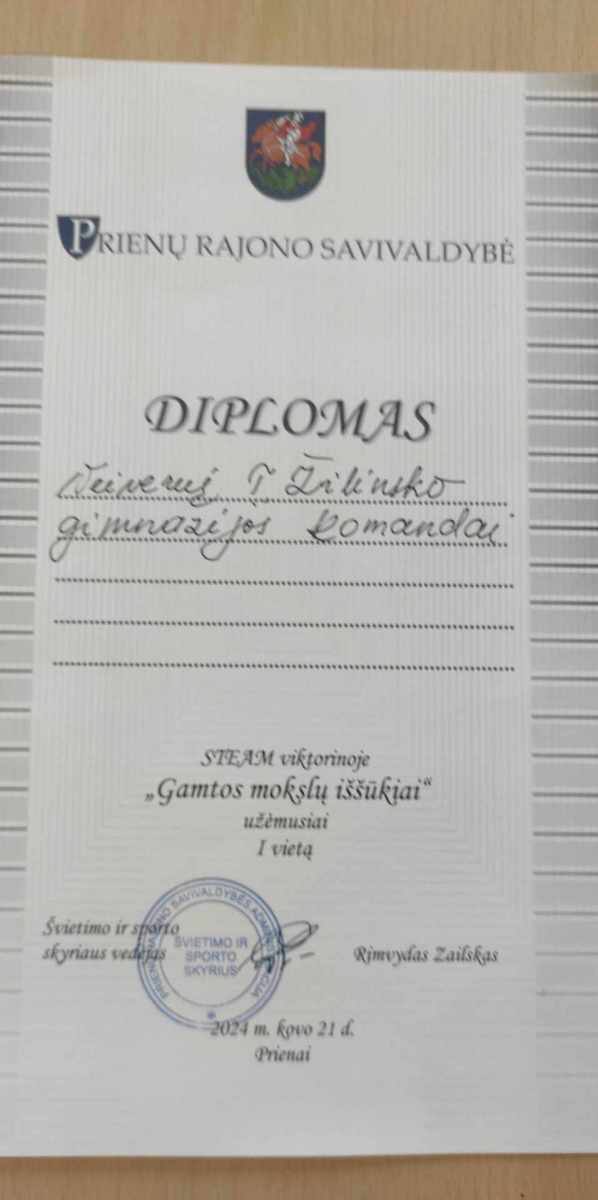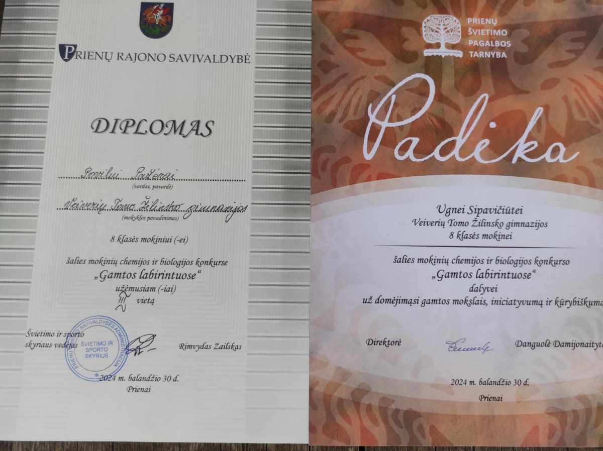 Respublikiniame chemijos ir biologijos konkurse ,,Gamtos labirintai”, kurio tema – išlikimas gamtoje, vykusiame Prienų ,,Žiburio” gimnazijoje, 8 klasės mokinys Povilas Pažėra užėmė III vietą, o Ugnė Sipavičiūtė apdovanota padėka už domėjimąsi gamtos mokslais, iniciatyvumą ir kūrybiškumą. Džiaugiamės mokinių pasiekimais ir linkime tolimesnės sėkmės, atskleidžiant gamtos labirintų paslaptis.