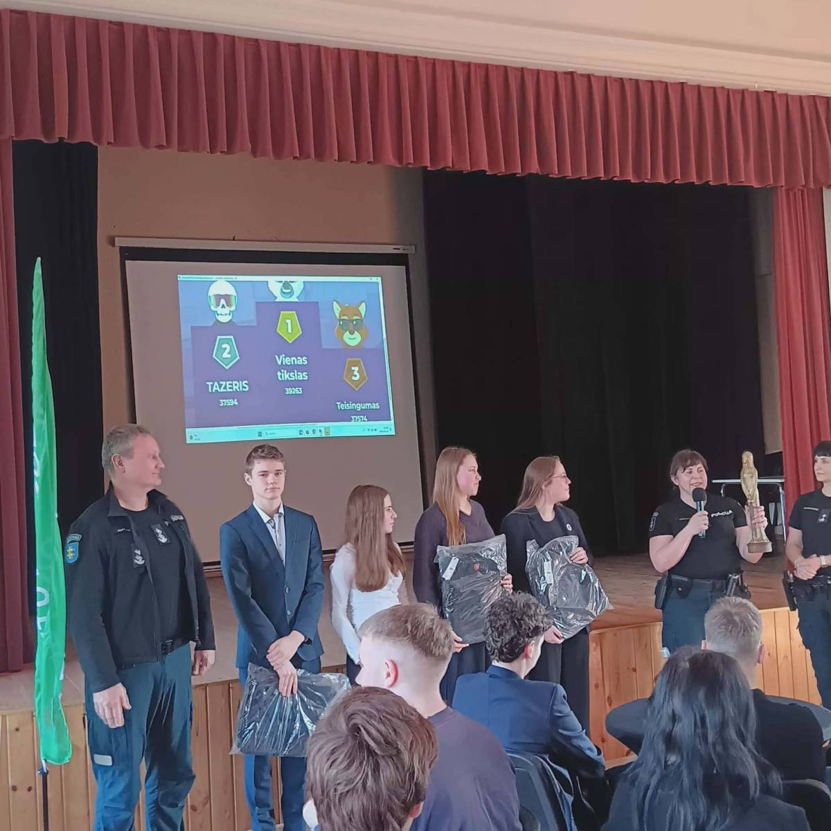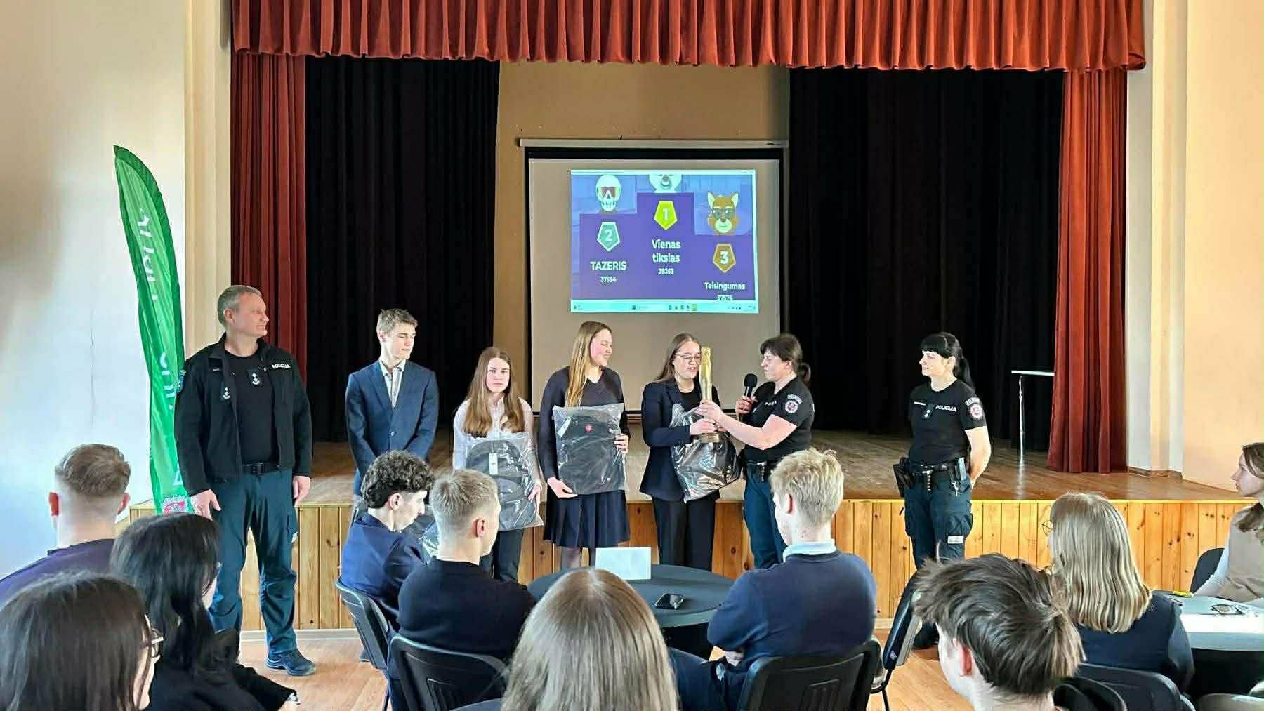 Kaip ir kiekvienais metais, kovo mėnesį vyko konkurso „Aš ir policija“ pirmasis etapas. Šiais metais konkursas buvo organizuojamas mūsų gimnazijoje, Veiveriuose, nes pernai mūsų komanda iškovojo pirmąją vietą ir parsivežė pereinamąjį prizą – Temidės statulą.